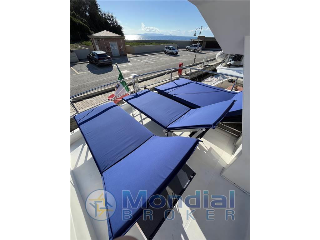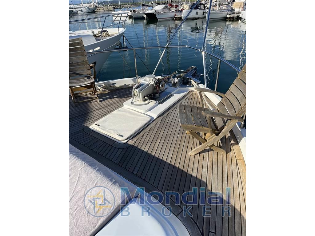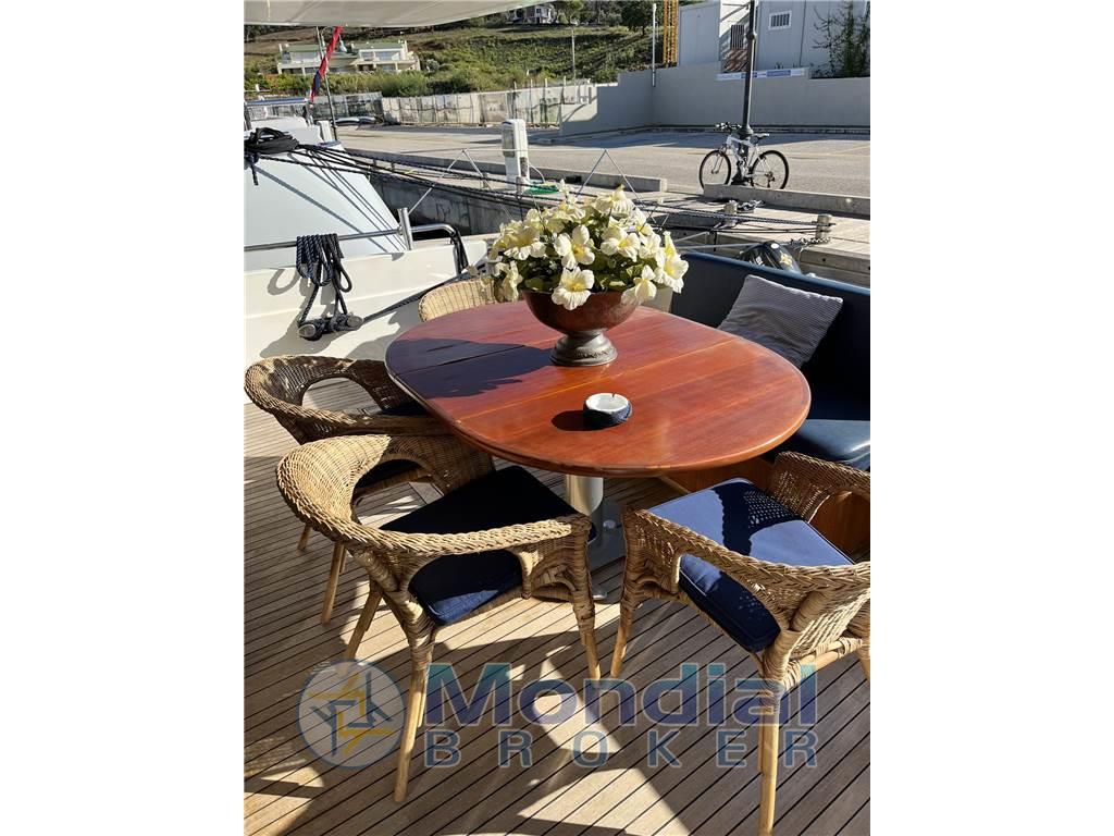 Notas internasNotas de la instrumentaciónAngolo barra, Bussola, Contamiglia, Ecoscandaglio, GPS (Geonav 11 Fly), Interfono, Pilota automatico (Robertson), Plotter (Ray M. C-80), Radar (Furuno), Radio VHF (Ray M 218), SSB.Notas de armamentoAllestimento tecnico e di coperta:Allarme motore, Allarme sentina, Autogonfiabile, Doccia esterna, Doppia timoneria, Elica di prua - bow thruster, Flap idraulici, Impianto antincendio (in tutti gli ambienti), Lavaggio catena, Passerella (Idraulica), Piattaforma, 4 Pompa di sentina elettrica (+ zona cabine), Pompa di sentina manuale, Pozzetto Teak, Salpa Ancore Elettrico, Scaletta da bagno, Tavolo pozzetto, Tender (Eurovinil 270 Yamaha 4T 4HP), 2 Winch tonneggio di poppa. Dotazioni domestiche di bordo: Aria condizionata, Impianto acque nere (300l/t), Prese interne 12v, Prese interne 220v, 3 WC marino elettrico. Dotazioni di sicurezza: Dotazioni di sicurezza entro 12 miglia, E.P.I.R.B.. Intrattenimento: Antenna Satellitare TV, DVD, Impianto TV, Stereo (Sony), 5 TV (cabine,salone, cab. marinai). Cucina ed elettrodomestici: Forno (el.Whirpool), Frigorifero interno (N°2), Ghiacciaia, Lavastoviglie (Indesit), Lavatrice (Indesit), Microonde. Tappezzerie: Bimini, Cuscineria di prua, Cuscineria fly. |
