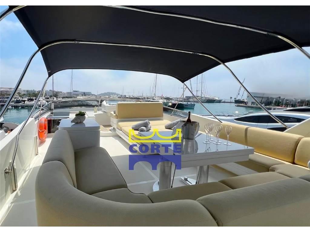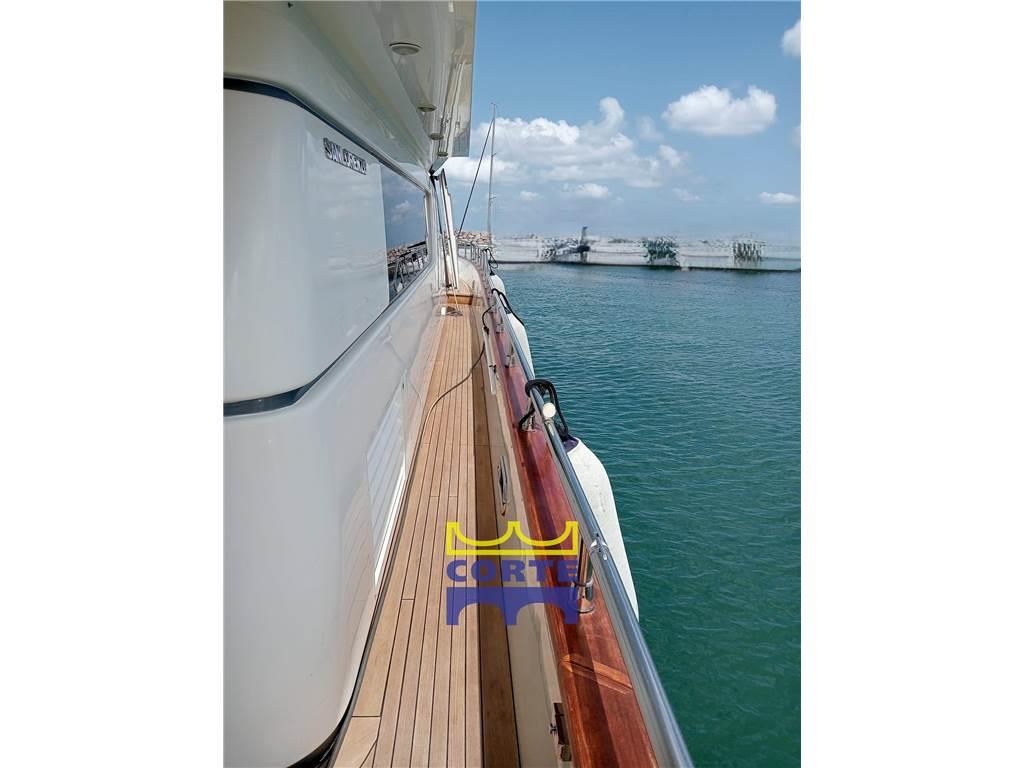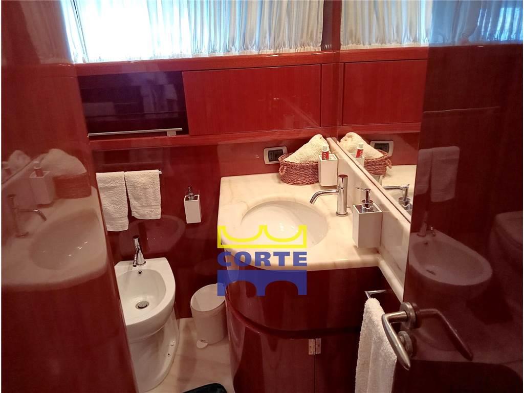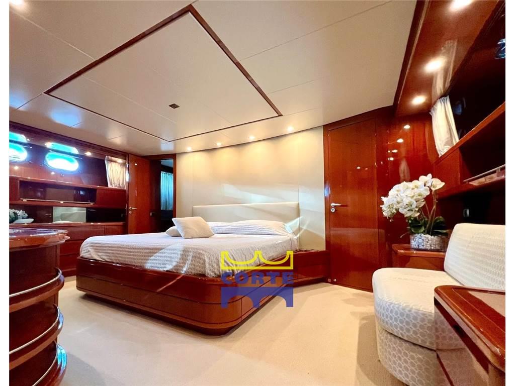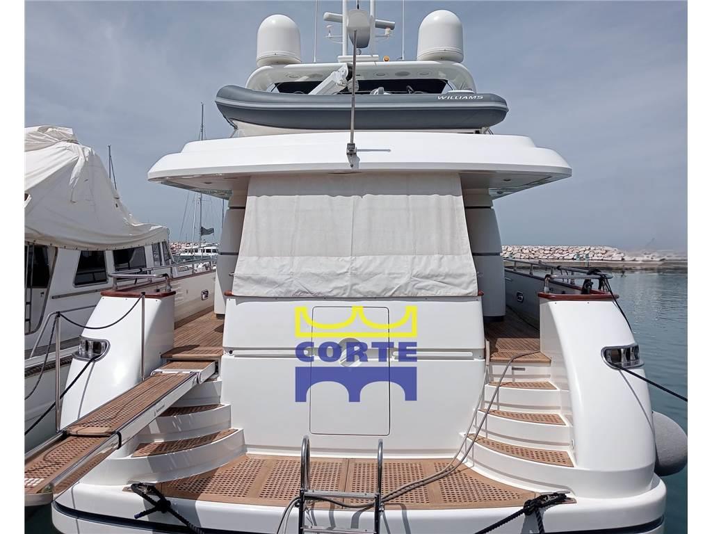 Notas internasNotas de la instrumentaciónAntenna radar, Bussola, Comando motori elettronico, Computer di bordo, Contametri catena, Contamiglia, Display, Ecoscandaglio, Log, Pilota automatico (ST 70), Plotter con antenna GPS, Radar (64 mg), Radio VHF (Ray 240E plancia e fly), Sedile Copilota.Notas de armamentoAllestimento tecnico e di coperta:Allarme fumo/gas, Allarme motore, Allarme sentina, Ancora, Bocche di Lupa, Camminamenti laterali in teak, Doccia esterna, Doppia timoneria, Elica di prua - bow thruster (idraulica), Flap elettrici, Gruette per tender su fly, Impianto antincendio, Passerella (elettroidraulica a scomparsa), Piattaforma (di poppa in teak), Pompa di sentina automatica, Pompa di sentina elettrica, Pompa di sentina manuale, Porta ingresso, Porta laterale, Pozzetto Teak, Presa 220V banchina, Presa acqua banchina, Rollbar, Salpa Ancore Elettrico, Scaletta da bagno, Tavolo pozzetto, Tromba, 2 Winch tonneggio di poppa, 2 Winch tonneggio di prua. Dotazioni domestiche di bordo: Aria condizionata (108.000 BTU), Clima reversibile, Dissalatore (Idromar 130 l/h), Impianto acque nere, Inverter (per frigorifero, impianto TV e Hi-Fi e flaps), Pavimento interno in legno, Prese interne 12v, Prese interne 220v, Serbatoio Acque Nere, WC marino elettrico. Intrattenimento: Altoparlanti, Antenna Satellitare TV, Impianto TV, Stereo, 7 TV (LCD in salone e Hi-Fi, zona pranzo, cucina, cabina armatore con Hi-Fi, cabina VIP con Hi-Fi, cabina ospiti con Hi-Fi, cabina comandante con car stereo). Cucina ed elettrodomestici: Asciugatrice (nel gavone di poppa), Congelatore, Cucina, Forno, Frigorifero esterno, Frigorifero interno, Lavastoviglie, Lavatrice (nel gavone di poppa), Piastra elettrica. Tappezzerie: Bimini (top), Cuscineria completa, Tendalino. |