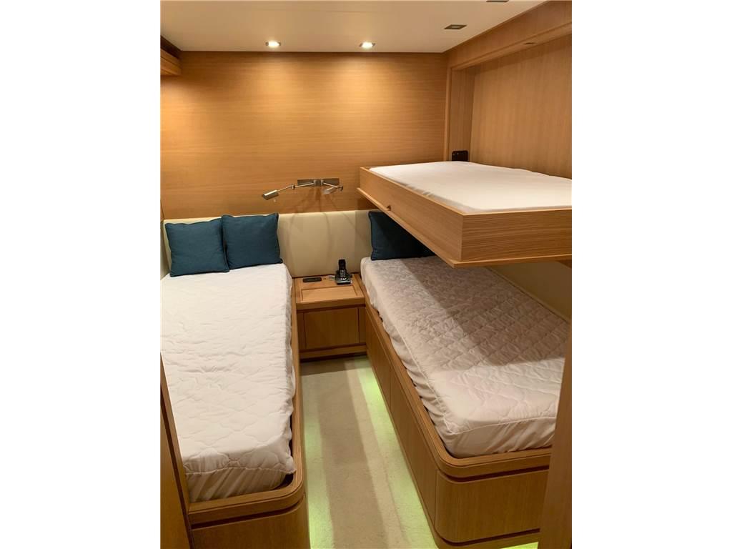 Notas internasNotas de la instrumentaciónAngolo barra, Bussola, Contamiglia, Ecoscandaglio, Fax, GPS, Interfono, Pilota automatico, Plotter, Radar, Radio VHF, SSB.Notas de armamentoAllestimento tecnico e di coperta:Allarme sentina, Autogonfiabile, Doccia esterna, Faro orientabile, Flap idraulici, Gruette, Impianto antincendio, Lavaggio catena, Piattaforma, Raddrizzatore, Salpa Ancore Elettrico, Scaletta da bagno, Winch tonneggio di prua. Dotazioni domestiche di bordo: Aria condizionata, Riscaldamento. Intrattenimento: Stereo, TV. Cucina ed elettrodomestici: Forno, ICE Maker, Lavastoviglie, Lavatrice, Microonde. Tappezzerie: Cuscineria fly. |
