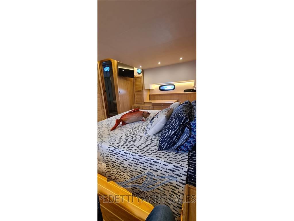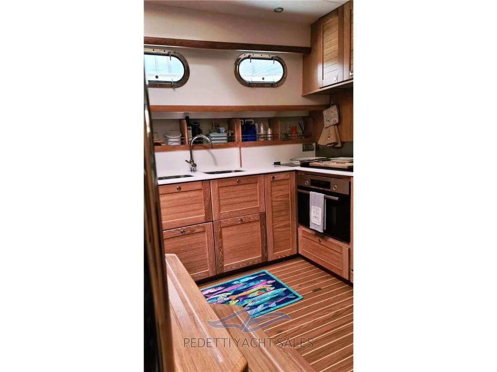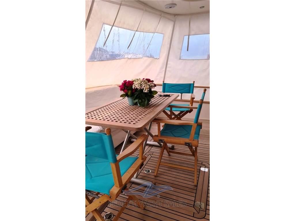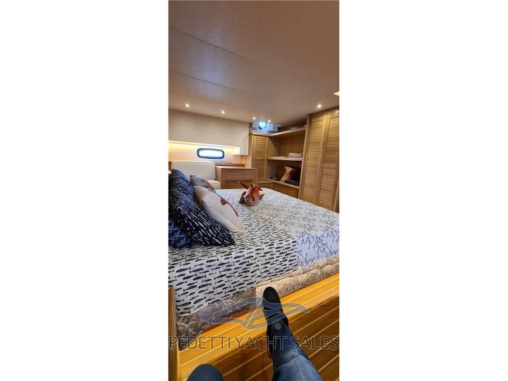 Notas de armamentoAria condizionata (con pompa di calore, sistema chiller), Bimini (fly), Boiler, Cassaforte (in cabina armatoriale) Copripozzetto, Cuscineria completa (poppa, prendisole prua e Fly), Digitale Terrestre, Dissalatore (140 lt/h), Dotazioni di sicurezza oltre 12 miglia, Forno (microonde-combo), 2 Frigoriferi interni (in cucina a tutta altezza e in salone), Ghiacciaia (a pozzetto in cucina), piano cottura induzione, Impianto acque nere (con elettrovalvola di scarico), Impianto TV (sistema Up&Down in salone e Tv 40" in cabina armatoriale), Inverter (2Kw), Piastra in vetroceramica, Prese interne 12v, Prese interne 220v, Stereo (sistema FUSION collegato con impianto TV), Teli copri finestra, Allarme motore, Allarme sentina, Ancora ULTRA in acciaio,Autoclave, Autogonfiabile, Caricabatterie, Doccia esterna poppa e prua, Doppia timoneria, Elica di poppa - stern thruster, Elica di prua - bow thruster, Faro orientabile, Flap elettrici (Zipwake), Passerella (idraulica a scomparsa), Piattaforma (idraulica), Pompa di sentina elettrica, Pozzetto Teak, Presa 220V banchina, Presa acqua banchina, Salpa Ancore Elettrico, Tromba elettropneumatica, chiusura pozzetto invernale ed estiva in microforato, copertura fly, luci di cortesia interne ed interne.