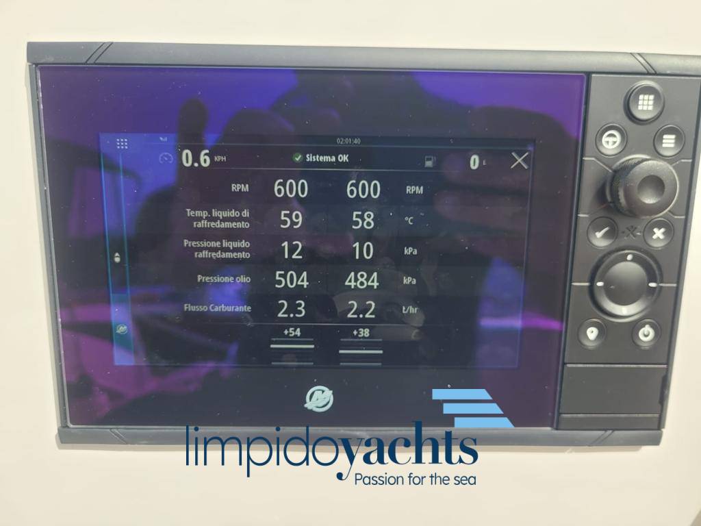 Notas internas-1 seduta di guida center console -1 prendisole di pura -1 spogliatoio con bagno e doccia sotto console Notas de la instrumentación- teak sintetico- cuscineria completa nuova - doppia scaletta da bagno - tavolo elettrico con doppia funzione - doccetta di poppa - tendaggi completi Notas de armamento- manette elettroniche- gps garmin - impianto stereo nerz - contacatene quick - bussola magnetica - radio vhf |
