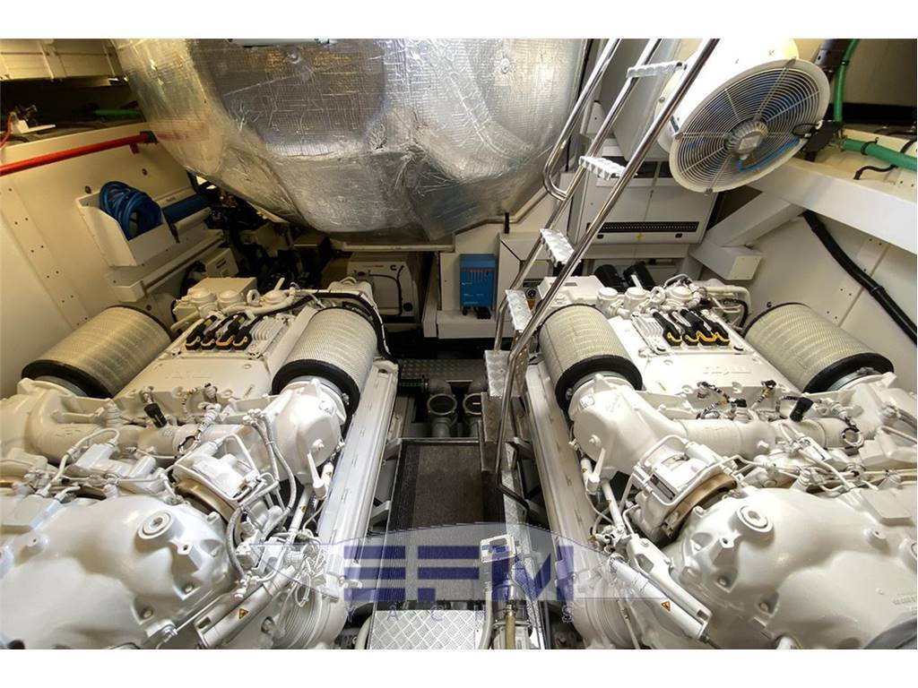 Notas internasBerths 8 + 2 Head compartments 3 + 1 4 Staterooms plus crew aft, VIP has private access forward from main helm area. Master Suite and 2 guest cabins access via amidship stairway. Master Suite-Amidship: ? Centerline king berth w/storage below ? 2 x Nightstands ? Large walk-in closet w/hanging rails, drawers and shelves ? 55" Samsung TV ? Harmon Kardon Blu-ray/DVD/CD/FM radio w/stereo speakers ? Vanity table w/stool ? 2 x Sofa seats and breakfast table ? En suite Head w/Stall shower ? Panoramic window w/opening portholes Guest Cabins (P & S): ? Double berth w/storage below (S) ? Twin berths w/Sliding option to create double berth (P) ? Night stand ? Hanging locker ? ? 24" LG TV ? DVD/CD/FM radio w/stereo speakers ? En suite Head w/stall shower VIP Suite-Forward: ? Private entry from helm area ? Centerline queen berth w/storage below ? Walk-in closet ? Storage cabinets ? 40" Samsung TV ? Harmon Kardon Blu-ray/DVD/CD/FM radio w/stereo speakers ? En Suite Head w/Stall shower Crew Quarters-Aft: ? Transom entry ? 2 x Over/under twin berth cabins ? 24" LG TV ? Fusion DVD/CD/Radio w/stereo speakers ? Miele washer and dryer ? Crew lounge w/Waeco refrigerator, Whirlpool microwave oven ? Head w/shower Notas de la instrumentaciónHelm and Observation Area? Main Helm Console and Observation Area ? 2 x upholstered helm seats with electric operation ? Hydraulic power steering ? 3 x Hatteland System X displays-2 for navigation, 1 for monitoring ? 2 x Simrad Halo Compression radar ? Simrad Autopilot ? Simrad Depth and speed displays ? Simrad VHF radio ? Simrad AIS w/integrated GPS receiver ? Simrad Go-Free wireless access for Ipad ? Magnetic compass ? Remote searchlight control ? Trim tab controls ? Digital engine instrumentation ? Fresh water & Fuel gauges ? Main control and monitoring panel (AC/DC) with generators control ? Monitoring panel for fire detection system ? Fire extinguisher ? Manual side opening door to starboard side deck ? Sofa seat with table on port side ? 24" LG TV ? Fusion DVD/CD/radio ? Tropic Spec Air conditioning Mechanical ? Twin MTU 12V 2000 M94 @1950 hp each ? Fuel filters/water separators to engines ? Fuel filters/water separators to generators ? Separ Fuel polishing system ? Sleipner hydraulic stabilizers w/at-anchor stabilization ? Sleipner hydraulic Bow and Stern thrusters ? Oil change system for engines, gearboxes and generators ? Standby fresh water pump ? Plumbing and wiring for future water maker ? Manual/automatic fire extinguishing system combined with engines, generators ? Automatic bilge and flood pumps with high-level alarms ? Exhaust fans ? Generator exhaust silencers and water separators ? Sensor connected to fire detection system ? Tropic spec A/C Electrical ? 2 x 22kW Onan generators ? Electrical Seamless Transfer for A/V equipment ? Isolation transformer ? 24v DC electrical system with full circuit-breaker protection ? 8 x 24v starter batteries ? 12 x 24v domestic batteries ? Automatic battery charge distribution ? Remote battery switches controlled from aft cockpit locker ? 120 amp battery charger/inverter for 24v circuits ? 200 amp battery charger/inverter for 24v circuits ? 3 x 2kW immersion heaters for water heater ? AC sockets throughout the boat Notas de armamento• Tender Williams 445 turbojet (2014)• Tender Garage • Bow Thruster • Stern Thruster • Bimini top • Stabilizers Sleipner fins (underway + zero speed) • Hydraulic Flaps • Flaps Indicators • Air Conditioning • Inverter Air Conditioning • Gangway • Teak Cockpit • Teak Side Decks • Watermaker • Icemaker • BBQ/Grill • Cockpit table • AIS • Navigation instruments • - Autopilot • - Chartplotter • - DSC vhf • - 3 x Electronic engine control • - GPS • - Radar • - VHF Radio • Fire Extinguishing System • Underwater lights • Directional Spotlight • Courtesy Lights • Headlights fixed on the stem • Domotic Controller • Audio Video: • - Hi-Fi • - Home Theater • - Radio AM/FM • - Satellite Decoder • - Satellite TV antenna • - Speakers • - TV • Coffee Machine • Refrigerator • Dishwasher • Electric hot plate • Oven • Washer dryer • Bow Winches • 2 x Stern Winches • Chain counter • Anchor Chain Washdown • Deck Shower • Shore power connector • Horn • Battery charger • Side door • 3 x Electric Toilet • Heater • Cushions on bow, cockpit and flybridge • Instruments Cover - Seat |