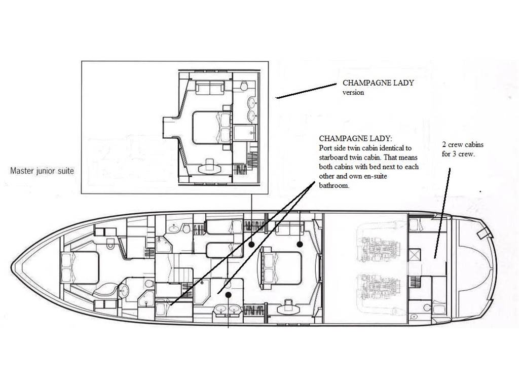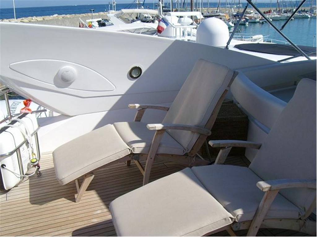 Notas internasAccommodation Number of cabins: 4 Number of bathrooms: 4 Master suite and VIP cabin with en-suite bathroom and the 2 twin cabins with en-suite bathrooms. 2 crew cabins aft with one single and one double bed and one bathroom. The accommodation on this 2008 Sunseeker 82 Yacht offers 8 berths in 4 cabins, including a spacious en suite master, good sized en suite VIP and 2 twin en suite cabins. Notas de la instrumentación• American style fridge freezer• Ceramic hob Microwave/oven • Dishwasher • Flybridge wetbar with sink, icemaker, coolchest & Gaganeau lava coal electric BBQ grill • Aft cockpit wetbar with cool chest & rubbish bin • U-line WC15 wine cooler located in bar island in galley • 2 x Kohler generators 23kw • Glendinning Cablemaster - 2 x power feed & recovery of shorepower 50amp 220v AC cable • Isolation transformer • Seamless transfer • AC shorepower/battery charger • Remote controlled spotlight at bow • Air conditioning • HRO Seafari SFM 1160-2 (183 lph) water maker with fresh water flushing • Bow & stern thrusters • Hydraulic lifting platform • Electric anchor winch with foredeck & flybridge controls • Stern winches • Teak cockpit, flybridge, side decks, bathing platform & step • Canvas covers for all flybridge seating, bow cushions/seats & flybridge table • Deck wash with outlets forward, aft & to flybridge • 2 brick safes with digital locks fitted in master & VIP staterooms • General Ecology Seagull IV X-6 double system water purifier for cold water supply • Hot & cold swimming shower at stern • Hard top over fly bridge • Satellite Fleet 33 in G8 dome with handset, fax & data point • VHF with DSC triple station • Captains cupboard housing PC, printer, fax & mobile VHFs • Radar/chartplotter with GPS Simrad RS87 • Electronic speed & depth displays Autopilot • Power assisted steering • Satellite Navision G8 TV system with 5 decoders • 42" Sony LCD TV in master stateroom • 32" Sony LCD TV in VIP stateroom • Sony DAV-D150 DVD/CD/VCR 5:1 Cinema surround sound system in VIP stateroom • Hi-fi DVD/CD/radio surround sound system to saloon & master stateroom • DVD/CD players in guest cabins • Sony central PC distribution system Notas de armamentoOptions• Fixed hard top with opening section • Air conditioning, compressors located in engine room • Hydraulic lifting platform • Side opening helm access door • Side opening galley access door • Flybridge wetbar with sink, ice maker, cool chest and griddle • Flatscreen televisions in all cabins • Bose Lifestyle hi-fi surround-sound system • DVD/CD player in guest cabins • Aft cockpit wetbar with rubbish bin and cool chest • Electric refrigerator, freezer and ice maker • Ceramic hob, microwave/oven and dishwasher • Electronic depth and speed displays • Radar/Chart plotter with GPS • Autopilot • VHF handset (dual station) • Hydraulic bow thruster • Hydraulic stern thruster • Fresh-water marina connection • Teak bathing platform and steps • Teak side decks • Teak cockpit floor • Teak flybridge floor |