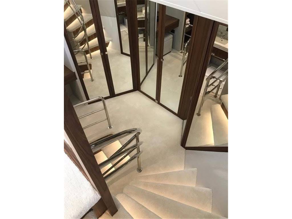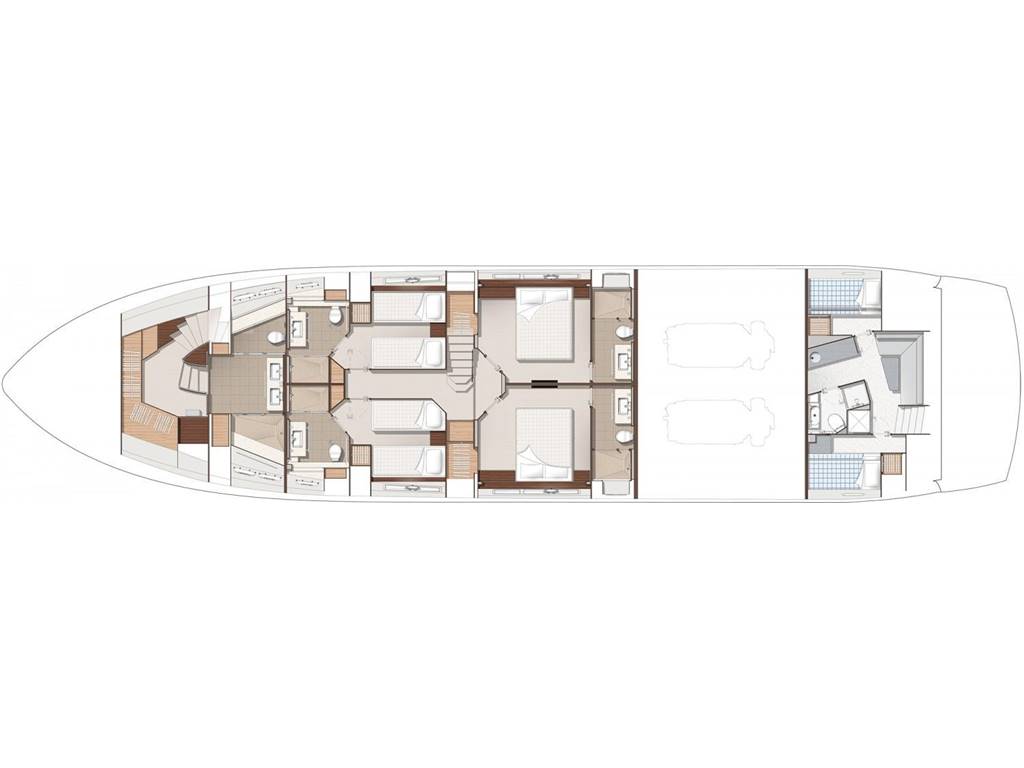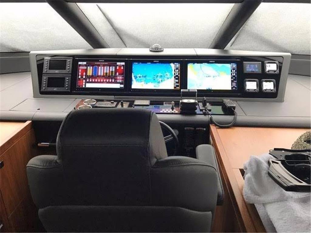 Notas internasNumber of cabins: 5 Number of heads: 6 Guest Cabins: 2 x Port and Starboard amidship staterooms • 2 x Queen athwartships berths w/storage below • Hanging locker • Panasonic PABX telephone • 32" Samsung HD LED TV w/Sony Blu-ray Cinema system • Sonos Connect wireless audio streaming • En suite head w/shower 2 x Port and Starboard forward staterooms • 2 x Twin berths w/storage below • Hanging locker • Night stand • Panasonic PABX telephone • 32" Samsung HD LED TV w/Harmon Kardon Blu-Ray Cinema system • En suite head w/shower Master Suite • On Deck • King size berth w/storage below • 2 x Nightstands • Panoramic windows • Settee w/center dinette table • 55" Samsung TV • Sonos Connect wireless audio streaming • MarineAir A/C • Panasonic PABX telephone exchange system • Stairway to lower level • Dressing room with large walk-in closet, drawer and cabinet storage, refrigerator • Digital safe • En suite head w/dual sinks, shower Crew Quarters • Transom entry • 2 cabins w/twin over/under berths (P & S) (Total of 4 twin berths) • Head w/shower • Crew mess w/L-settee w/table • 22" Samsung TV • Fusion DVD/CD/FM • Miele Washer and Dryer • Whirlpool microwave oven • Waeco refrigerator/freezer • Panasonic PABX telephone Notas de la instrumentaciónFly Bridge• Hard top w/retractable center canopy and aft extending sun canopy • Teak Deck • Carbon fiber companionway hatch • Large U-settee w/table • Storage lockers under seating • Teak dining table (natural finish) with stainless steel pedestal • Upholstered sunpad w/back rest • 3 Stool Wet bar w/ Waeco refrigerator, Vitrofrigo Icemaker, Cool box, Kenyon BBQ grill • TV • Davit • Spa hot tub • Deckwash outlet • 24v Low-level LED lighting • Radar arch structure • Overhead LED lighting on underside of radar arch (24v) Fly Bridge Helm: • 2 x Helm Seats (S) • Bench observation seat (P) • 3 x Simrad multi-touch monitors-one display for Sunseeker monitoring • Simrad Multifunction instrument • Simrad Autopilot • Simrad 2nd station VHF • Ritchie compass Helm: • 3 x Simrad multi-touch monitors w/NSO processor-One display for Sunseeker monitoring • Simrad radar • Simrad GPS • 3 x Simrad IS40 Multifuncition instruments • Simrad Autopilot system • Simrad VHF • Simrad GoFree wireless • Simrad AIS • Ritchie compass • Settee w/table • Fusion CD/FM sound system • Panasonic PABX telephone Mechanical • Twin MTU 12V 2000 M96L @1947 hp each • MTU Blue Vision automation systems • Hydraulic Sleipner bow and stern thruster system w/proportional dual station control • Sleipner stabilization system • Idromar water maker 250 ltr/hour • General Ecology Seagull in-line freshwater purifier • 2 x 200 ltr. Hot water heaters • Frieboy -Xintex fire alarm detection system • Sea Fire FM 200 fire extinguisher system • MarineAir tropic spec A/C system Electrical Equipment • 3 x 20kW @ 50Hz Kohler generators with underwater silent exhaust and sound box • Kohler power management system • Dockside AC connections • Isolation transformer • Atlas Voltage Regulator • 8 x 24v start-up batteries • 12 x 24v domestic batteries • Independent battery back-up for VHF radio • Atlas Voltage regulator • 1 x 120 amp battery charger/inverter for 24v circuits • 1 x 200 amp battery charger/inverter for 24v circuits • 8 x Lumishore white LED underwater lights • Vimar ByMe Interior premium lighting system Notas de armamentoAft Deck• Teak decking • Stairs to flybridge • Aft docking control station (S) w/engine control levers, stop/start panel for each engine, Side-power proportional bow & stern thruster control and horn • Aft fixed U-shaped bench seating w/teak table • Stern safety gates • 2 x 24v stern capstan winches • 24 v Overhead cockpit LED lights • Low-level courtesy LED lights • 4 x Sonance speakers (connected to salon AV system) • Wetbar w/Icemaker & refrigerator Salon • Stainless steel framed sliding patio door to aft cockpit • Sofa seating • Coffee table • Samsung 55" LED TV on rise and fall • Sonos Connect wireless audio streaming • Medium tint-windows and sliding door • MarineAir A/C • Drinks cabinet with glassware storage for eight LED overhead lighting (24v) • Sliding doors to starboard exterior balcony • Formal Dining area w/seating for 10 • Buffet cabinets • Carpeting • Day head (starboard foyer) • Stairway to raised pilothouse • Access to pantry & galley • Stairs leading to guest accommodations Galley • 2 x Frigoboat refrigerators and freezers • Miele Convection Oven • Miele Ceramic Cooktop • Miele Microwave • Miele Dishwasher • Miele Winecooler • Black Walnut Cabinetry w/granite countertops Deck Equipment • Teak decking on side decks, fore deck, aft deck, swim platform, stairways and fly bridge • Hydraulic lift platform • Removable SS swim ladder • Marquipt 8 step boarding ladder w/fittings (P & S) • 2 x Lewmar galvanized claw anchors (100kg & 50kg) each w/100m chain • Twin Lewmar electric windlass • Freshwater chain washer • 2 x Lewmar stern capstan winches • Bensenzoni passerelle • Starboard main deck balcony • Foredeck U-settee w/table • Foredeck sunpad with backrest |