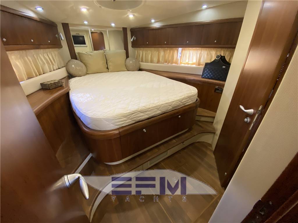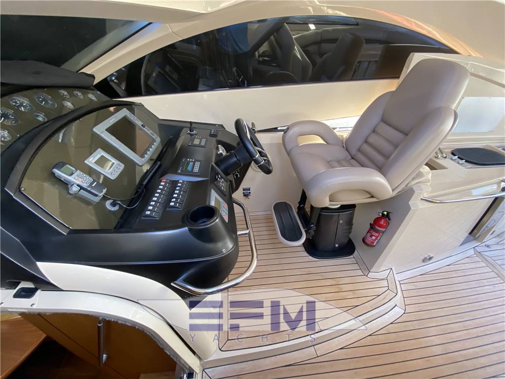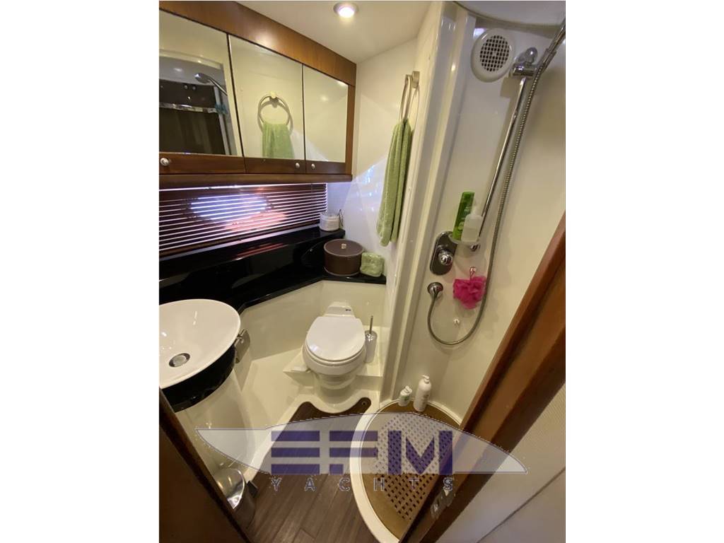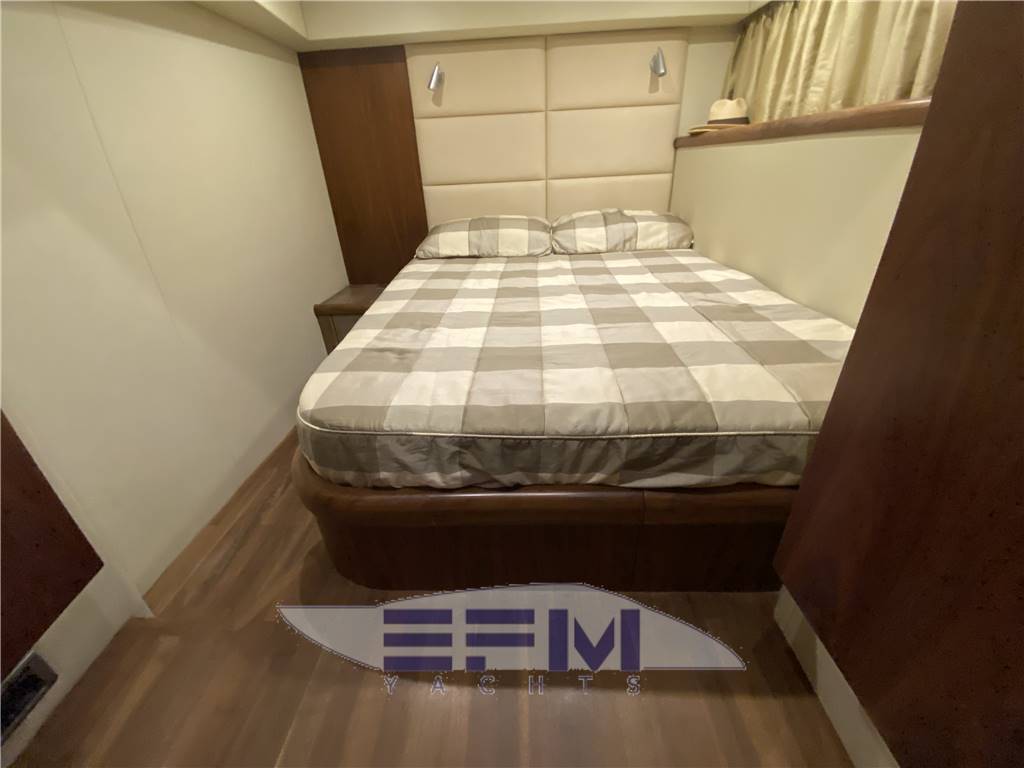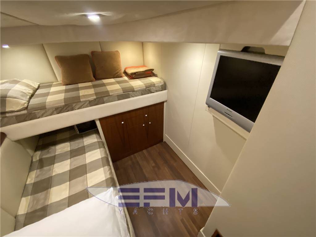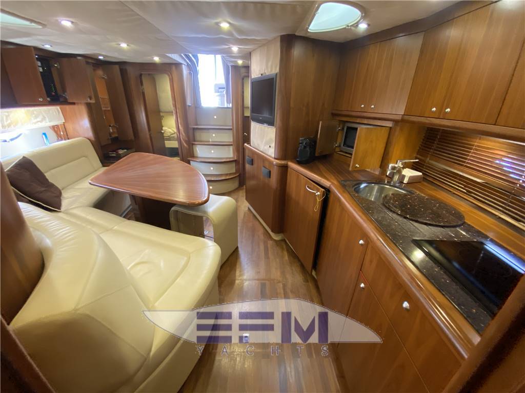 Classic high gloss cherry interior and carpeted floors - the lower deck on the starboard side the square consists of a large living room with sofa-shaped S in cream-colored leather and teak table crescent-shaped puff with 2 removable - In front of the sofa furniture to side with the LCD TV on the wall and plant Ski with DVD and stereo radio with CD player, which continues connected with the great walled kitchen complete with 4 burners + vCR + Panasonic microwave refrigerator, cabinets, pantry and cabinets for Kambusa. Entrance from the living room is on the left aft guest cabin with two twin beds and wardrobe furniture, LCD TV on the wall, and a private entrance to the large bathroom with electric toilet and separate shower cabinet and with external entrance also from the dinette. On the right hand there is the second guest cabin with two beds at The French and cupboards and drawers - the spacious forward cabin with large double bed with Sharp LCD TV on the wall and a private bathroom with electric toilet and shower cabinet separate - in the cockpit there is a large C-shaped sofa with teak table and retractable opposed the mobile kitchen complete with sink, cockpit fridge, electric stove and icemaker. Above all 'hangar for the tender are a large sundeck in the cockpit and on the ground' s access to the engine room