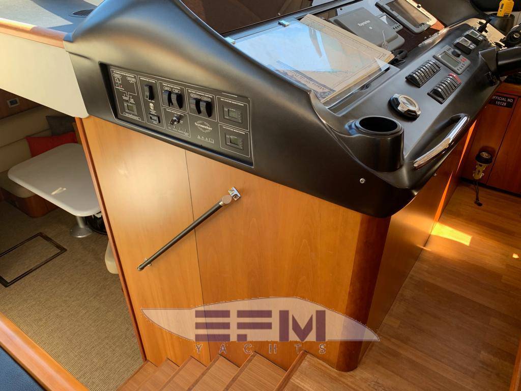 Notas internasNumber of single berths: 2 Number of double berths: 2 Number of cabins: 3 Number of crew cabins: 1 Number of heads: 3 Number of crew head: 1 The sleeping accommodation consists of the master cabin in the midships of the vessel, boasting a large centered double bed and sofa with cabinets either side. The Master cabin is complemented with an en-suite bathroom. The VIP guest cabin is located in the bow, which also demonstrates an en-suite bathroom. Finally a further twin cabin has twin single pull man bunkbeds, therefore allowing extra guests to stay. Notas de la instrumentaciónElectronics RAYMARINE? 2 GPS CHART PLOTTER / RADAR C 120 Autopilot ? Depth ? RAYMARINE VHF DSC ? Inverter / Charger with Helm Monitoring Remote Control System ? Radio & Weather Antenna ? Satellite ANTENNA ? Transducer Sonar Depth Finder ? Remote Access Cameras int/ext ? Bose Sound System ? Remote Windlass Control ? Compass ? Navigation center ? Autopilot ? Repeater(s) ? Wind speed and direction ? GPS ? Log-speedometer ? CD player ? VHF ? Radio ? DVD player ? Computer ? VCR ? TV set ? Cockpit speakers ? Depthsounder ? Plotter ? Radar Features ? Electric winch with deck and cockpit controls ? Hot and cold swimming shower ? Swimming ladder ? Full wet bar with ice maker, griddle, cool box and sink with hot and cold water ? Foot level courtesy lighting ? Radar, autopilot, electronic speedlog depth sounder, and VHF radio ? Hydraulic power steering ? Trim tabs ? Stainless steel sliding doors to cockpit ? Flatscreen televisions in all cabins ? Hi-fi DVD/CD surround system ? CD player for cockpit ? Ceramic hob ? Electric refrigerator and freezer ? Microwave/Grill ? Vacuum toilets and holding tank ? Hot and cold water system ? Automatic Fire Suppression System ? Automatic fire extinguishers ? Automatic bilge pumps ? AC shorepower/battery charger ? Slow speed generator with silent exhaust ? Fresh-water marina connection ? Teak bathing platform and steps ? Hydraulic lifting platform Notas de armamentoFlat screen TV in all cabins and saloonBose HiFi, surround system Air conditioning Kohler 13 kW generator Water maker 130 L/h Fridge, Freezer 4 burner ceramic hob Microwave Dishwasher Wine cooler Cockpit cooler and 2 burner hob. Hydraulic operated cockpit table. Hydraulic lifting platform Sliding hard top Electrically opening sun canopy Convertible aft sunbathing area Bow sunbathing area Led courtesy lightning Underwater lights Teak cockpit Teak saloon floor Tender 3.6m rib, 30hp four stroke engine Skiing equipment 2 life rafts, Lifejackets Epirb, SART Navtex Flares |