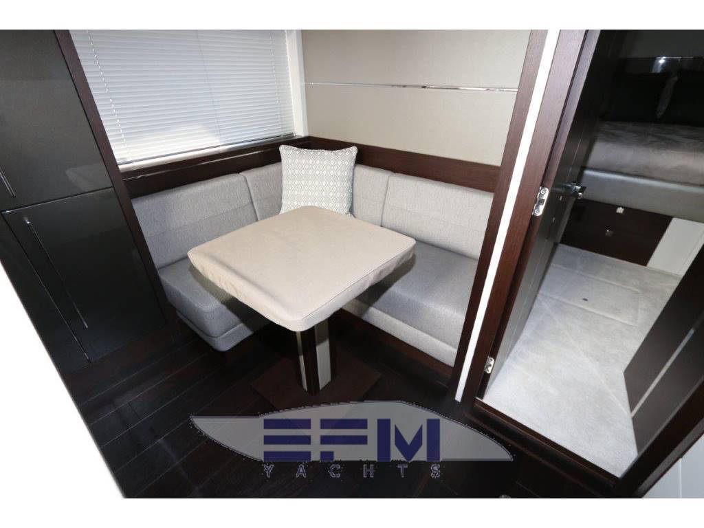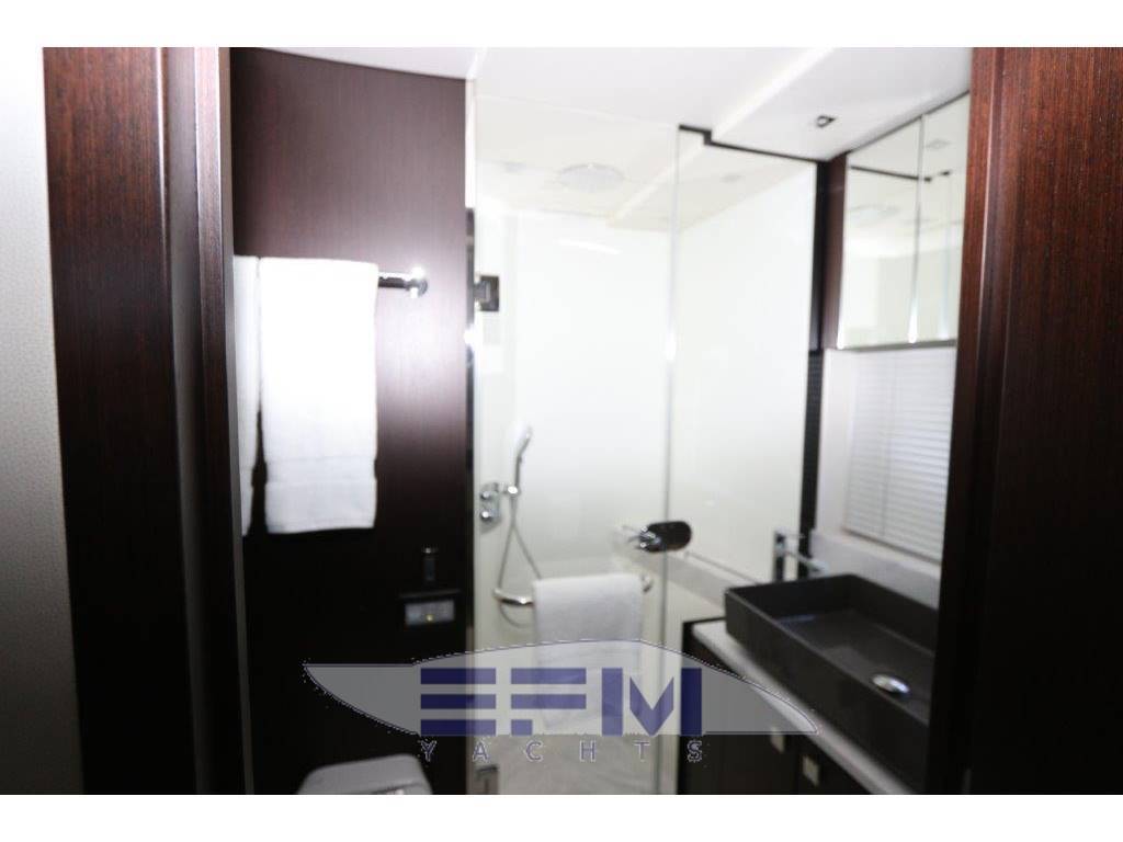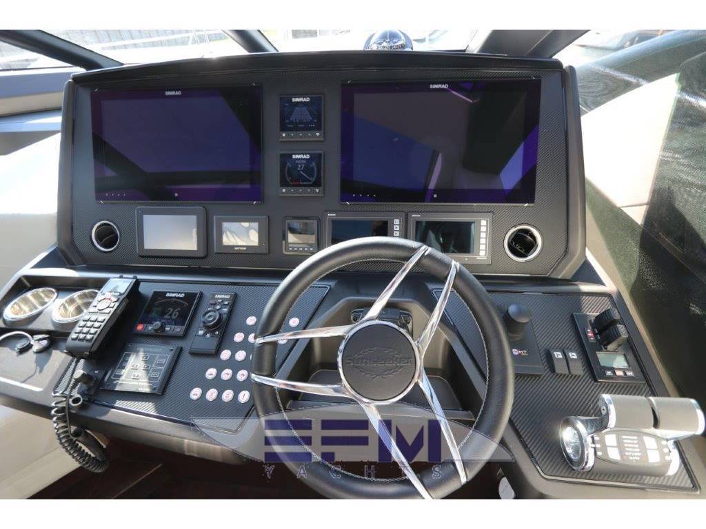 Notas internasNumber of cabins: 3 Number of heads: 3 Master-Aft: ? Full Beam ? Centerline King berth w/storage below ? 2 x Bedside nightstands ? Cabinet and drawer storage ? Walk-in closet ? 2 x Large windows w/opening portholes ? Seating w/table ? 40" Samsung TV w/Blu-Ray player, Sonos Playbar & Apple TV ? En Suite head and stall shower VIP-Forward: ? Centerline Queen berth w/storage below ? Cabinet and drawer storage ? Hanging Locker ? Overhead opening hatch w/screen and curtain ? 40" Samsung TV w/Blu-Ray player, Sonos Playbar & Apple TV ? En Suite head and stall shower Guest Cabin-Starboard: ? 2 x Twin berths w/storage below ? Twin berths have electrical slider to create a double berth ? Hanging locker ? Opening porthole w/screen ? 22" Samsung TV w/Blue-Ray player & Apple TV Crew Quarters: ? Transom Entry ? Twin over/under berths ? Splendide washer/dryer ? Drawer & Locker storage ? Head/shower Notas de la instrumentaciónHelm Console:? Opening Sunroof ? Side Access door ? Twin helm seats ? Sunseeker power management, boat monitoring & control system ? Simrad Go-Free wireless bridge ? Simrad speed and depth display ? Simrad Autopilot ? 2 x Simrad Multi-function touch screen display ? Simrad navigation controller & Simrad GPS ? Simrad Radar ? Simrad VHF w/DSC function ? Simrad AIS module w/GPS ? Sanshin Searchlight Mechanical ? Twin MAN V12's @1900 hp each ? Fuel filters/water separators for engines and gens ? Oil change system for engines, gear boxes and generator ? Automatic bilge and flood pumps w/high level alarms ? Hydraulic power steering ? FM200 fire extinguishing system ? Sleipner hydraulic stabilizers, A/C motor powered at anchor ? Sleipner hydralic bow and stern thrusters w/simultaneous dual proportional controls ? Wiring and plumbing for future watermaker installation ? 2 x CCTV cameras in engine room-Helm console display ? Tropic spec A/C Electrical ? 29kW Onan generator ? Low-level LED deck lights ? 4 x Lumishore white, underwater lights ? 8 x 24v Engine Batteries ? 6 x 24v House Batteries ? 24v Battery Charger ? Water Heater Notas de armamentoCockpit? Teak deck ? Large upholstered settee w/teak folding top pedestal table ? Wet bar w/Icemaker, Coolmatic cool box, Kenyon BBQ ? 4 x Sonance speakers ? Sunpad ? Retractable awning ? Sunbrella enclosure w/isinglass windows ? Engine room hatch Main Salon: ? Satin finish Wenge Open Grain joinery ? Satin finish wenge wood sole ? U-settee w/table ? Entertainment center w/55" Samsung TV, Blu-Ray player, Sonos playbar and Apple TV ? Observation settee opposite helm station Lower Salon and Galley ? Upholstered settee and table ? Breakfast bar ? 32" Samsung TV, Blu-Ray player, Sonos Playbar & Apple TV ? Satin finish Wenge Open Grain cabinetry ? Satin Wenge sole ? Gloss Sylmar Koko countertops ? Vitrifrigo Refrigerator w/lower 2 Drawer freezer ? Victrifrigo Wine Cooler ? Miele 4 burner cooktop ? Miele microwave oven ? Smeg exhaust fan ? Miele dishwasher ? 8 Place Settings-Royal Doulton china and Robert Walsh flatware Deck Equipment ? Teak Deck: Swim platform, cockpit, side decks and fore deck ? Stainless steel bow roller w/anchor stop ? Stainless steel bow plate ? 50 kg Delta anchor w/90 m galvanized chain ? Lewmar anchor winch ? Fore deck sunpad w/adjustable back rest ? Seating and table ? 2 Webasto refrigerator drawers under settee ? 2 x Sonance speakers ? Foredeck seating canopy ? Deck washdown system (fore deck and swim platform) ? Swim platform hydraulic lift ? Hot and cold water swim shower ? Stainless steel swim ladder ? Transom beach package w/fold down seat, overhead shower and Marine Can electric grill |