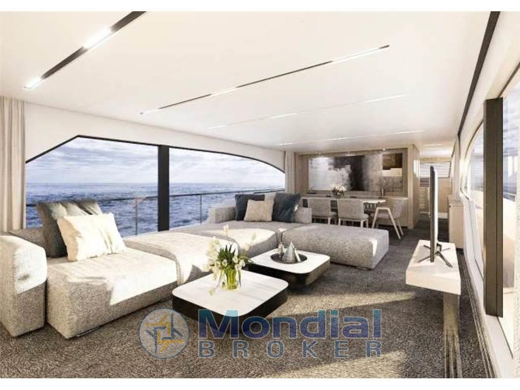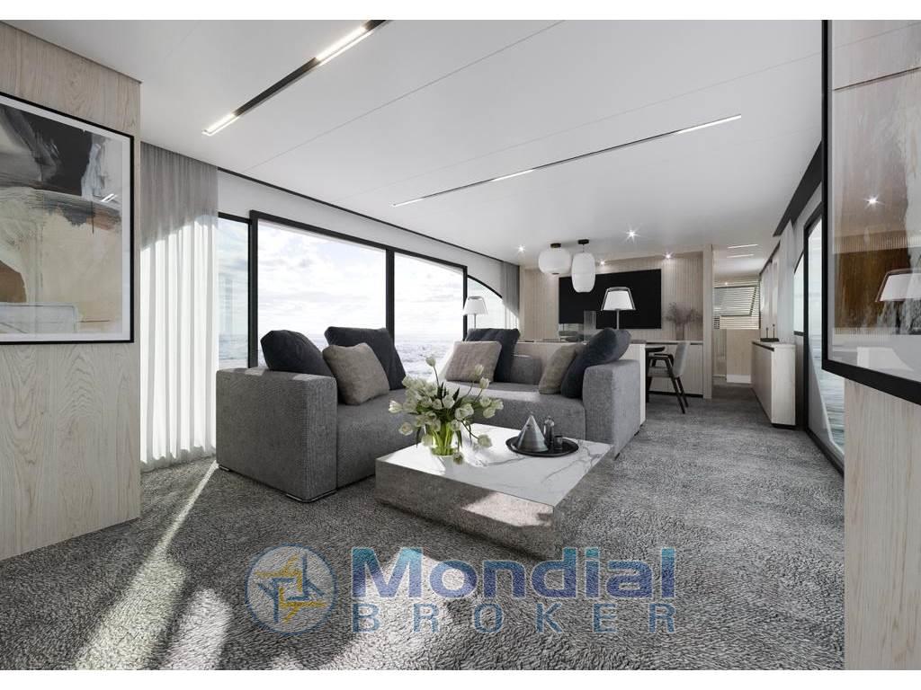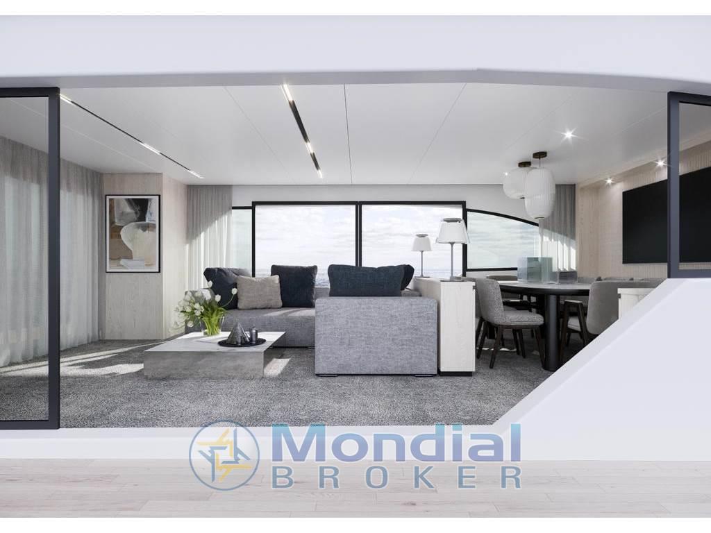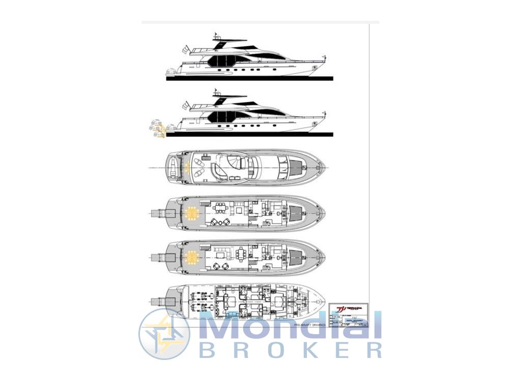 Notas internasNotas de la instrumentación• Controlli elettronici motori (acceleratori e invertitori)• Pannelli di controllo start/stop motori • Chart-plotter Gps display Raymarine serie eS127 • Radar display Raymarine serie eS127 (antenna HD OA 4kW) • Pilota Automatico Raymarine serie p70R • Angolo di barra Raymarine serie p70RS • Tridata con sensori speed, depth, temp., Raymarine serie i70s • Stazione meteo Airmar 220WX Nmea2000 • AIS650 e AIS100 Raymarine • Vhf Raymarine serie 260 • Bussola Ritchie SS5000 • Comando faro orientabile Jabsco • Comando tromba Kahlengberg • Joystick elicha direzionale prua, • strumentazione su ponte fly governo/navigazione diminuiti con ripetizioni e presa di ingaggio. • Antenna tv Satellitare Glomex Saturn 4 V9104s2 • Tromba di segnalazione • Fanali di navigazione e alla fonda come da regolamenti vigenti • Asta porta bandiera sopra hardtop e a poppa Notas de armamentosalone N° 1 smart tv 40 pollici + speaker bluetouth• camera armatoriale smart tv 32 pollici • camere ospiti laterali smart tv 28 pollici • camera V.I.P smart tv 28 pollici • pozzetto posteriore speakers bluetouth • flying bridge speakers bluetouth • prendisole di prua speaker bluetouth • impianto compatibile Android e IOS Impianto elettrico : • l’impianto elettrico di bordo verrà realizzato conformemente alle normative private yacht CE per imbarcazioni da diporto (sotto 24 mt L ) categoria A • Tensioni di esercizio : o 380V 50Hz trifase da presa di terra 63A con trasformatore d’isolamento 400V/230V da 40KVA o 400V/230V 50Hz trifase da 2 generatori per le linee corrente AC o 24Vcc da batterie per i circuiti CC e per avviamento motori o 24Vcc da batterie emergenza per i circuiti di emergenza • 12Vcc per l’avviamento dei gruppi elettrogeni Accessori principali : • Nr 02 ancore zincate da 125Kg • Nr 02 catene zincate 16mm (100 m ognuna) • Nr 02 verricelli salpancora Maxwell 5000W 380V • Nr 02 argani tonneggio Maxwell 3000W 380V • Nr 01 elica di manovra di prora elettrica 22Hp 16.2kW elettrica • Nr 01 elica di manovra di poppa 22 hp 16.2kw elettrica • Stabilizzatori CMC pinna da 1/1.2 mq elettrici • Dissalatore 160 lth • Passerella idraulica e trasformer poppiero per kg 500. • N° 4 bitte sul ponte principale con passacavo • N° 2 bitte a spiaggetta • Tergicrstalli sul parabrezza di timoneria • Copertura in pvc per le tappezzerie e tavoli e cruscotto esterni. Impianto Aria condizionata : • Impianto aria condizionata condaria/dometic • Impianto aria condizionata centralizzato circa 120,000 BTU con ciclo reversibile caldo/freddo per clima Mediterraneo Dotazioni di sicurezza : • Nr 02 Zattere salvataggio • Nr 10 parabordi Polyform F6 con copri-parabordo Nr 02 parabordi Polyform A3 con copri-parabordo 100mt cima ormeggio nylon d.30mm • 100mt cima ormeggio nylon d.20mm 50mt cima ormeggio d. 20mm • Nr 02 mezzi marinai • Kit dotazio |