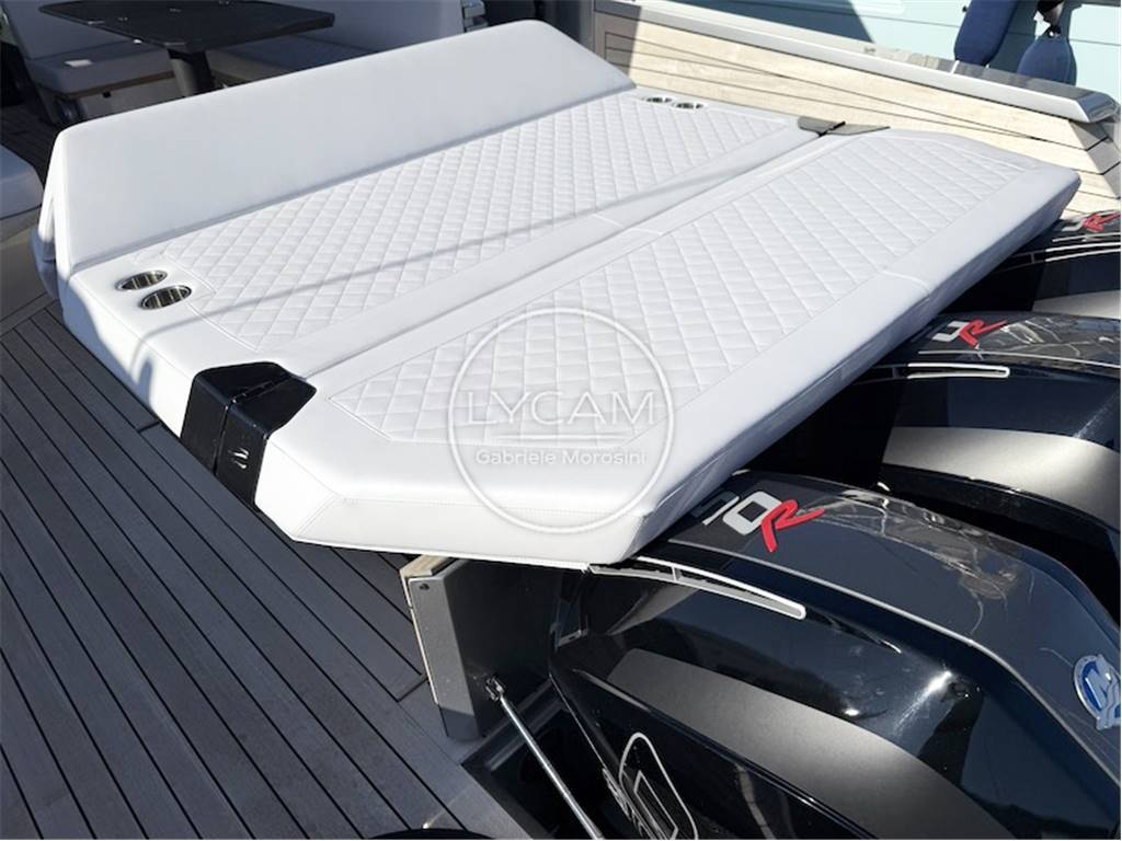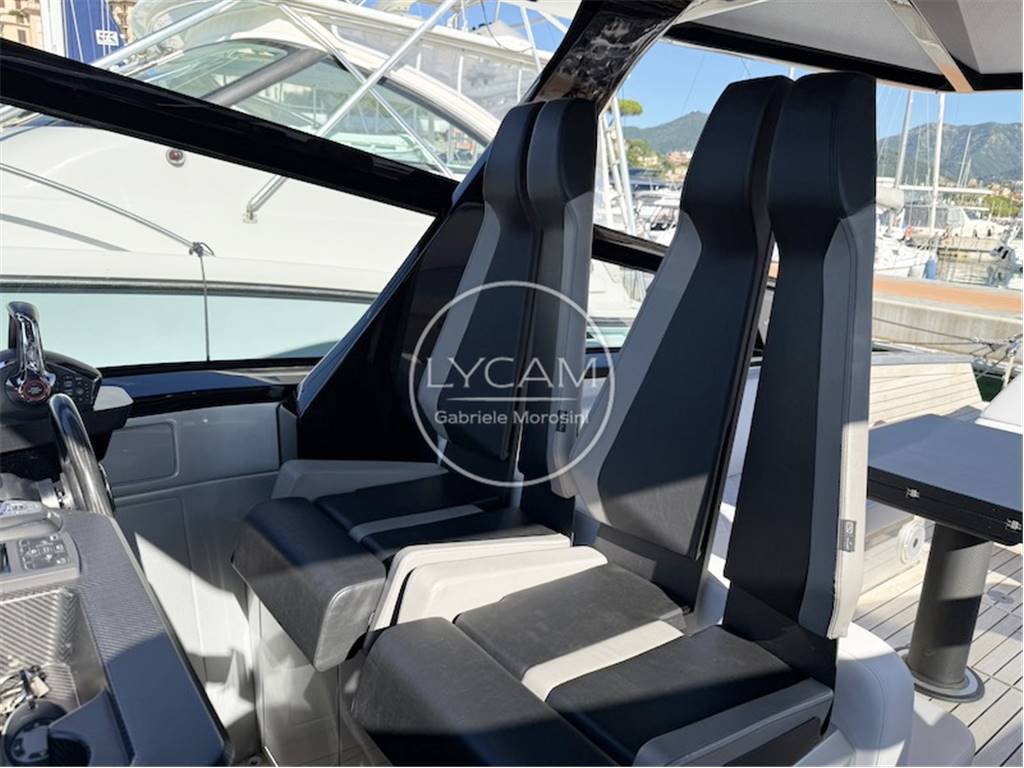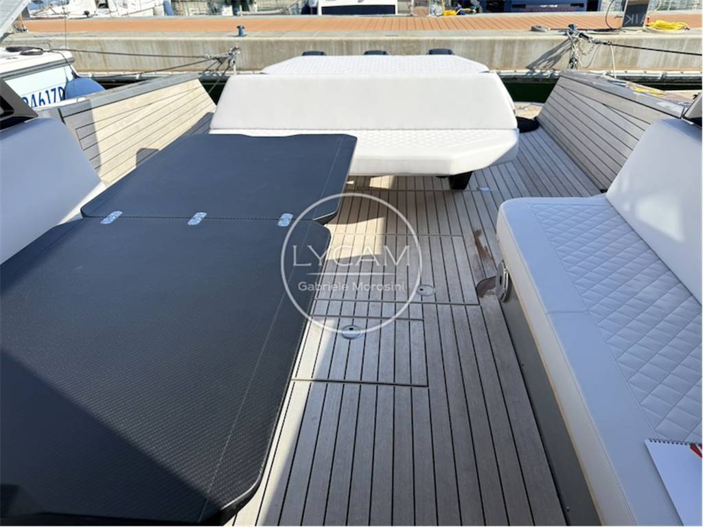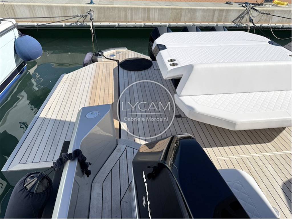 Notas de armamentoLa barca è equipaggiata con: Luci di navigazione; Luce di fonda; Faro brandeggio; Tergicristalli in carbonio; Sirena; Verricello ancora elettrico; Ancora; Bitte ormeggio; Plancetta in teak; Pozzetto in teak; Tavolo pozzetto; Doccia pozzetto; Passerella idraulica; Giro stabilizzatori Seakeeper (56 ore); Generatore Mase 8,5 Kw (200 ore); Cuscinerie prendisole esterni; Tendalino prendisole poppa; Inverter 2.000 V; Aria condizionata; Ghiacciaia 230V; Dotazioni di sicurezza (12 persone); Batterie; Caricabatterie; Stacca batterie; Presa 220V; Mezzo marinaio; Altoparlanti dinette; Asta portabandier
