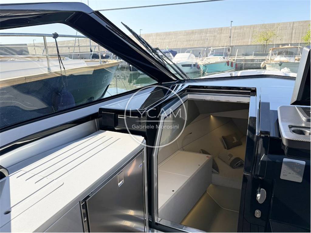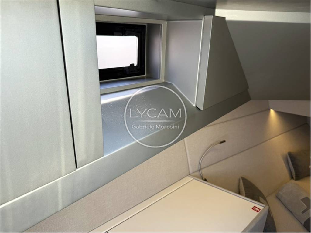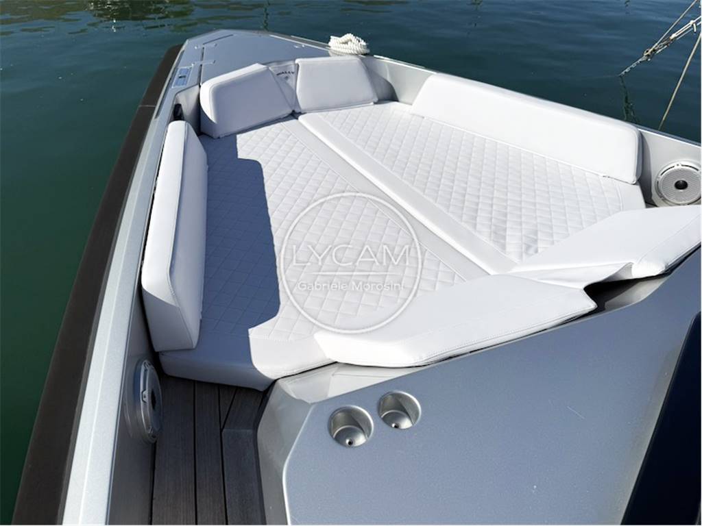Notas internasAttraverso la piccola ma funzionale plancetta di poppa dotata di passerella idraulica s’accede all’ampio e pratico pozzetto walkaround. Nella zona poppiera, davanti i motori fuoribordo è stato collocato in posizione centrale il comodo prendisole. Caratteristica di quest’area sono le murate abbattibili che permettono un contatto diretto con il mare. Procedendo verso prua si trova la dinette a L sulla dritta, mentre sul lato opposto un funzionale mobile bar-cucina. Più avanti sulla dritta, protetta dal tendalino rigido, è stata collocata la timoneria con le 2 sedute per pilota e co-pilota. A sinistra si trova l’accesso per la discesa sottocoperta. Internamente è stata allestita una cabina matrimoniale prodiera con il bagno di servizio. La parte prodiera della coperta è adibita a zona prendisole.